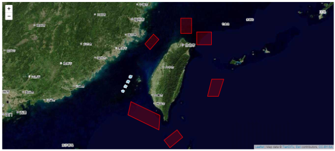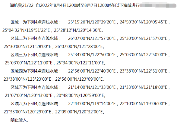 在上面的信息中, 其实就包含一些很重要的时空信息,比如预警的时间是2024年7月15日到10月15日,中间差不多有三个月的时间,在这三个月的时间内,是不允许其它的船舶驶入上述的区域内的。作为GIS开发者,我们除了重点关注预警的时间范围,更关心的是空间范围。如果假定是一些商用船舶,我们就可以提取这些空间数据,在进行航线规划的时候,绕开这些作业区域,不仅能保证航行安全,也是加快作业效率。关注新闻的朋友一定知道,一些重要的行动需要对某一些区域进行管控的,也是会经过地方海事局进行公开位置,然后在规定的时间内进行。而这些区域不仅仅是一块区域,而是多个区域同时进行,从而锤炼不同的队伍的实战能力。如下图发布的航行警告中就包括6个区域(即面数据)。