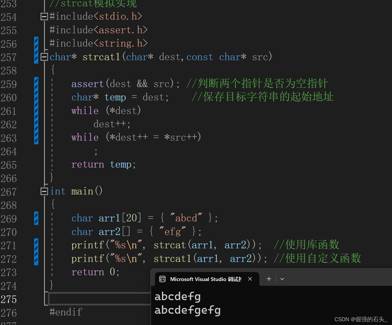 赋值后检查*dest是否为'\0',判断循环是否继续 然后再执行后置++