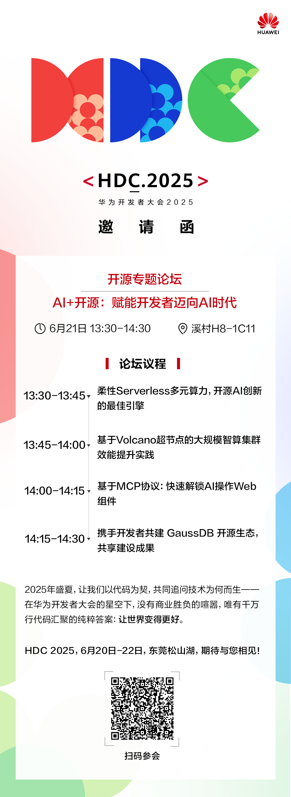 更多活动信息可登录华为开发者大会2025官网查看,欢迎开发者预约报名开源专题论坛,积极参与开发者活动。我们诚挚地邀请每一位怀揣开源热忱的开发者共赴这场年度盛会,携手探索、学习与成长。