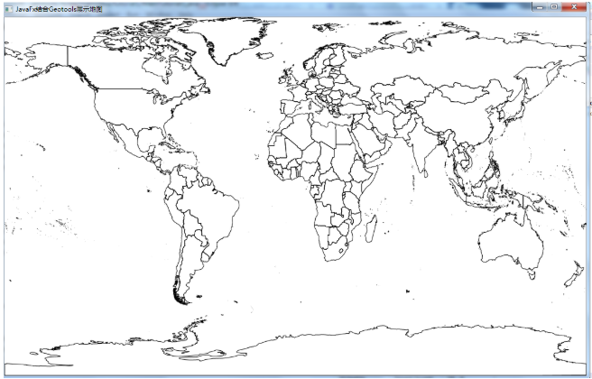 上面的代码非常简单,通过创建的Canvas对象,然后设置一个地图展示的高度和宽度。将创建的对象和JavaFx的Scene进行绑定,最后设置好JavaFx的应用窗口的标题后,调用Show方法实现空间数据的可视化展示,最后运行的可视化效果如下: