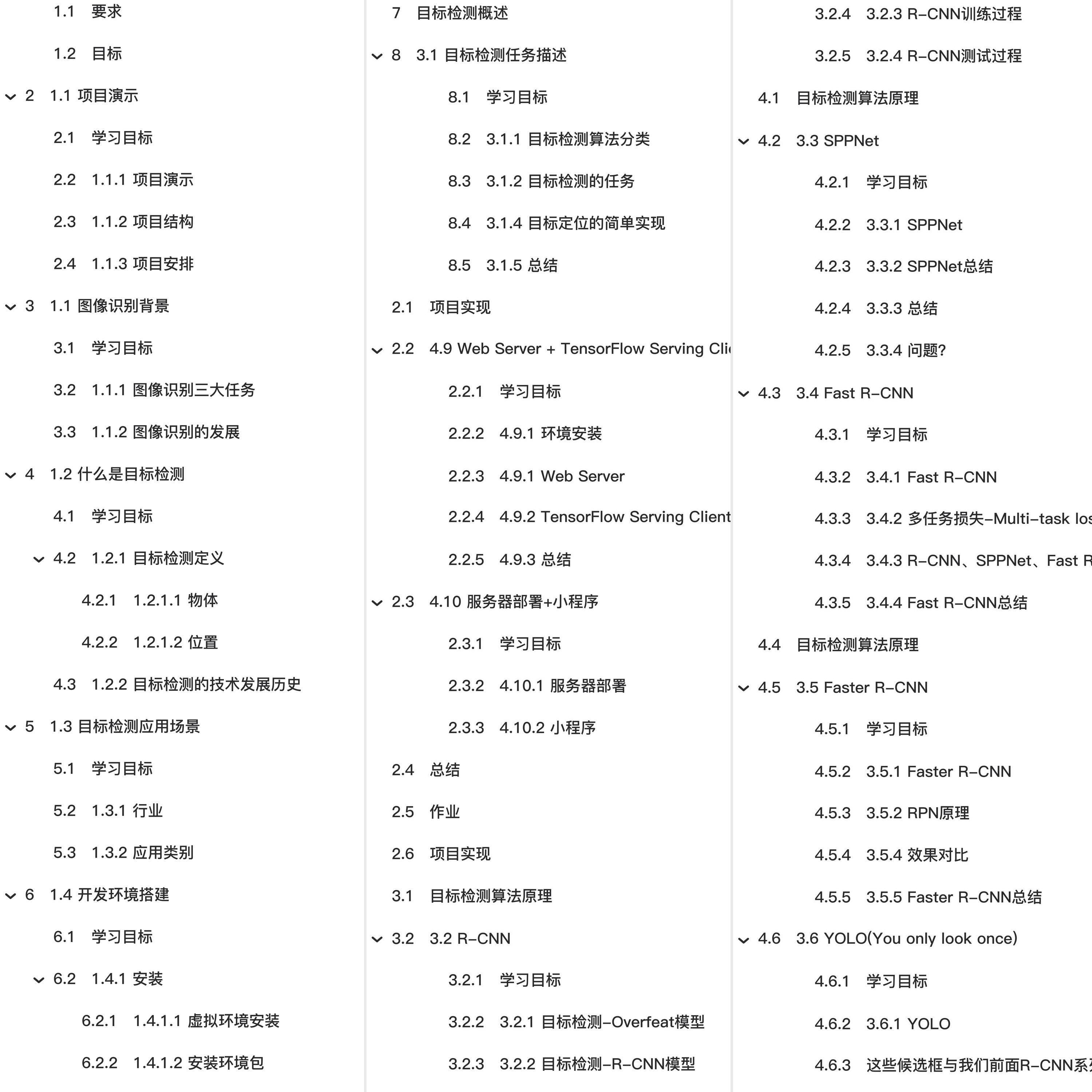 教程总体简介:要求 目标 1.1 项目演示 学习目标 1.1 图像识别背景 1.2 什么是目标检测 1.2.1 目标检测定义 1.2.1.1 物体 1.3 目标检测应用场景 1.3.1 行业 1.3.2 应用类别 1.4 开发环境搭建 目标检测概述 3.1 目标检测任务描述 3.1.4 目标定位的简单实现 项目实现 4.9 Web Server + TensorFlow Serving Client 4.9.1 环境安装 4.9.1 Web Server 4.10 服务器部署+小程序 4.10.2 小程序 目标检测算法原理 3.2 R-CNN 3.2.1 目标检测-Overfeat模型 3.2.7 问题? 3.3 SPPNet 3.5 Faster R-CNN 3.5.2 RPN原理 3.5.4 效果对比 3.6 YOLO(You only look once) 3.6.1 YOLO 这些候选框与我们前面R-CNN系列算法中有哪些不同? 3.6.2 单元格(grid cell) 3.6.3 非最大抑制(NMS) 3.6.4 训练 3.7 SSD(Single Shot MultiBox Detector) 3.7.1 SSD 问题:SSD中的多个Detector & classifier有什么作用? 3.7.2 训练与测试流程 3.8 TensorFlowSSD接口 3.8.1 接口文件 数据集处理 2.2 目标数据集标记 2.3 数据集格式转换 2.3.2 TFRecords文件 2.3.3 案例:VOC2007数据集转换 2.4 slim库介绍 2.4.2 导入以及API介绍 4.1 项目结构介绍 4.1.2 项目代码训练架构设计 4.2 数据模块接口 4.2.1 功能需求 4.2.3 商品数据模块代码编写 4.4 预处理 4.4.2 数据增强 4.5 多GPU训练 4.5.1 训练步骤以及设备部署需求 4.5.2 运行过程与代码编写 主函数训练逻辑 一、选择设备初始配置初始部署设备信息 Create global_step. 选择全局步长变量所在的设备 获取类 获取网络参数 初始化网络 获取形状 获取default anchors 默认只返回一个样本 进行数据的批处理以及获取到队列当中(获取多个数据) 要获取批处理:[image, gclasses, glocalisations, gscores] 单列表? Tensor 列表 重叠的列表进行转换成单列表 r包含着多个样本 计算所有GPU / CPU设备的平均损失和每个变量的梯度总和 获取训练的OP以及摘要OP pre-trained模型路径. 开始训练 4.6 测试