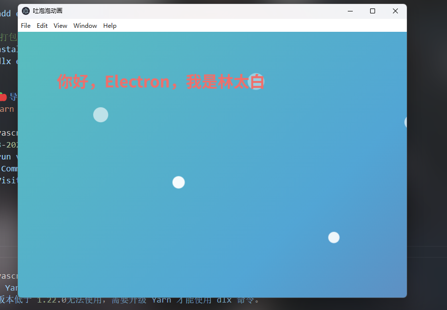 <h1 style="color:#ff6969;position: relative;left: 10%;top: 10%;z-index: 11;">你好,Electron,我是林太白</h1>