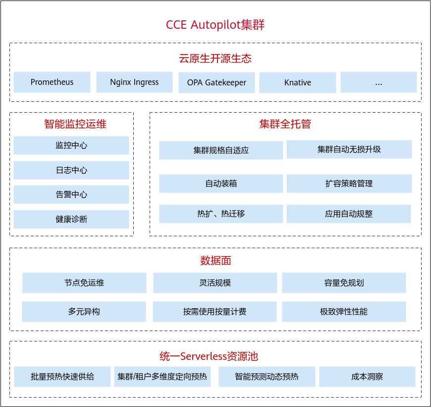 CCE Autopilot集群是云容器引擎服务推出的Serverless版集群,为您提供免运维的容器服务,并提供经过优化的Kubernetes兼容能力。在创建CCE Autopilot集群后,您无需购买节点即可部署应用,同时也无需对节点的部署、管理和安全性进行维护,只需要关注应用业务逻辑的实现,可以大幅降低您的运维成本,提高应用程序的可靠性和可扩展性。