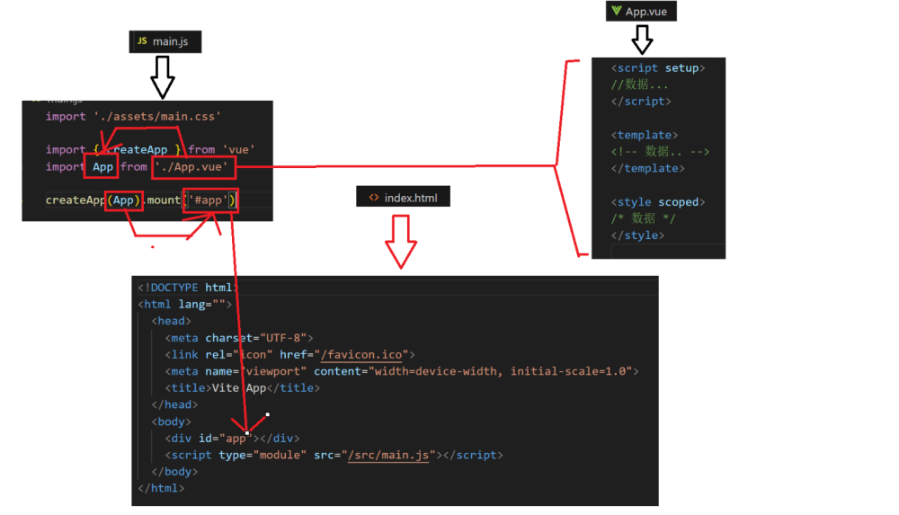 main.js负责将App.vue的代码整合起来创建应用,App.vue负责根层的组件,index.html负责将main.js打包形成的应用在网页中展示出来