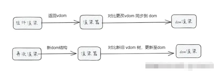 - 组件渲染(返回 vdom)=>渲染器 (对比更改vdom 同步到 dom) 在dom变化的时候都是对比vdom