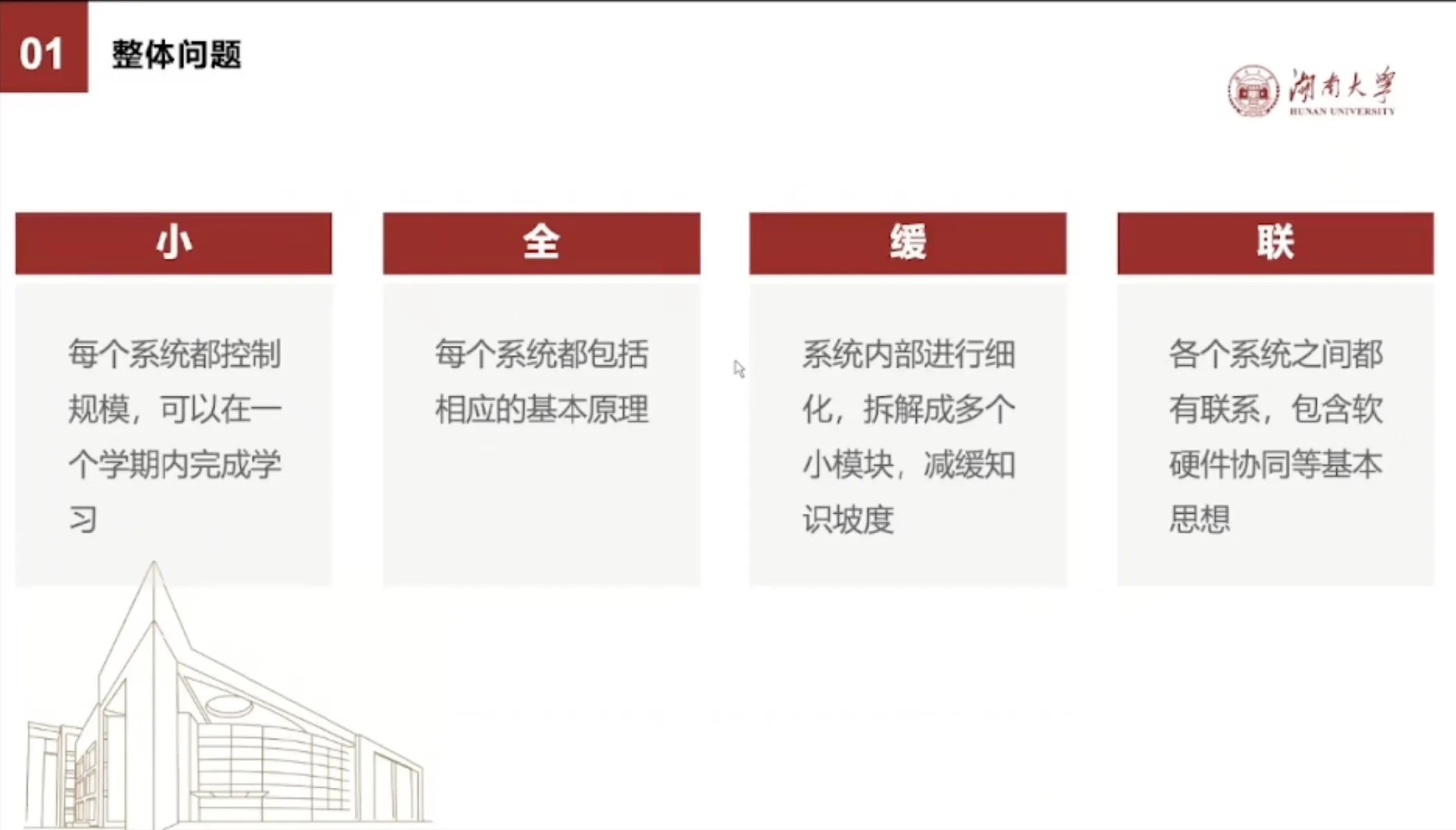 第一个是小,就是要求就是每个系统都控制规模,暂时不去考虑这个可靠性、运行性能、功耗等内容,专注于这个原理验证。一般我们是想在一个学期,也就是大概3到4个月的这样一个教学周期内,通过课程授课和实践动手,可以完成一个系统。