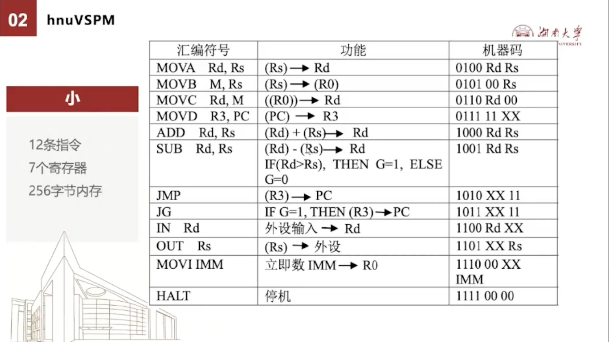 第一个是一个小,hnuVSPM也就是湖南大学非常简单原型机。这个CPU非常的小,硬件上我们只有七个寄存器,其中是有四个通用寄存器,一个是数据寄存器,还有一个指令寄存器,还有一个标志为寄存器。内存空间只有256个字节指令也只有12条。这12条指令如下: