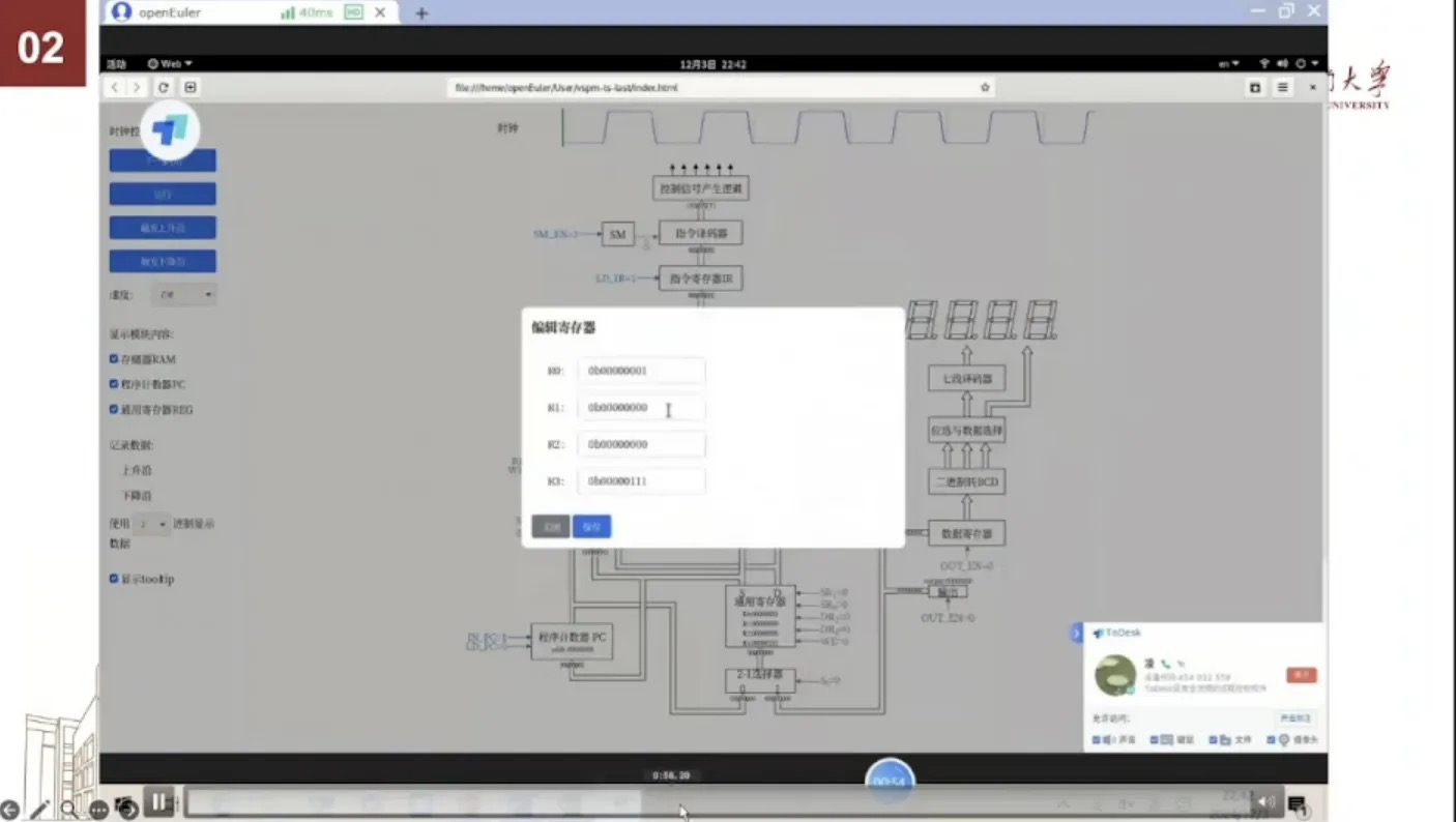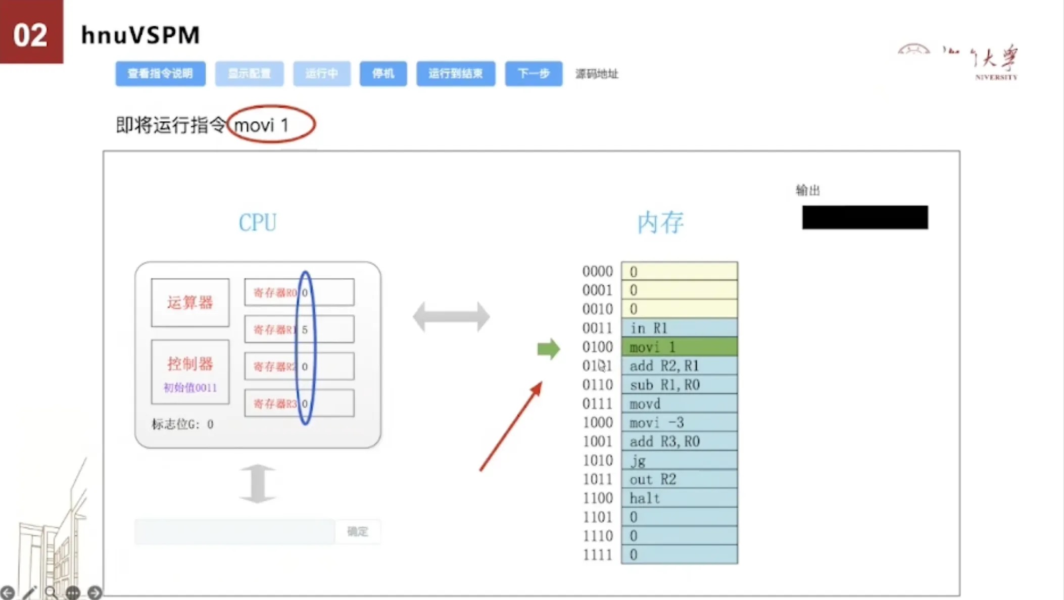 我们另外还开发了一个就是为了贴近实际的运行逻辑,开发了这个原型机的模拟器。学生可以在载入这个指令后分布运行,然后通过这种方式输入不停的命令来查看内存。