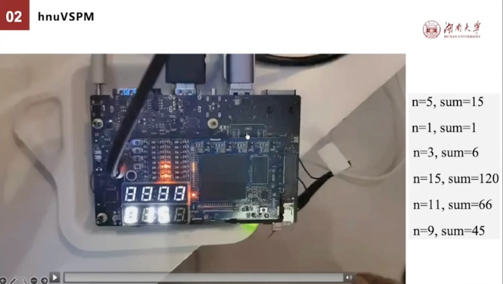 我们在计算机系统这门课,可以学习怎么来调试这个程序的运行。在这里有了这个基础,后面的这个就很容易去理解了。当然如果有条件的话,我们是可以把CPU烧录到香橙派鲲鹏Pro开发板,这样一来就相当于一个物理上的CPU。我们可以看一下,我们把刚才那一个累加和的程序,已经和CPU一起烧录到了这个上面。这样就我们可以真实来看一下这个运行的结果。