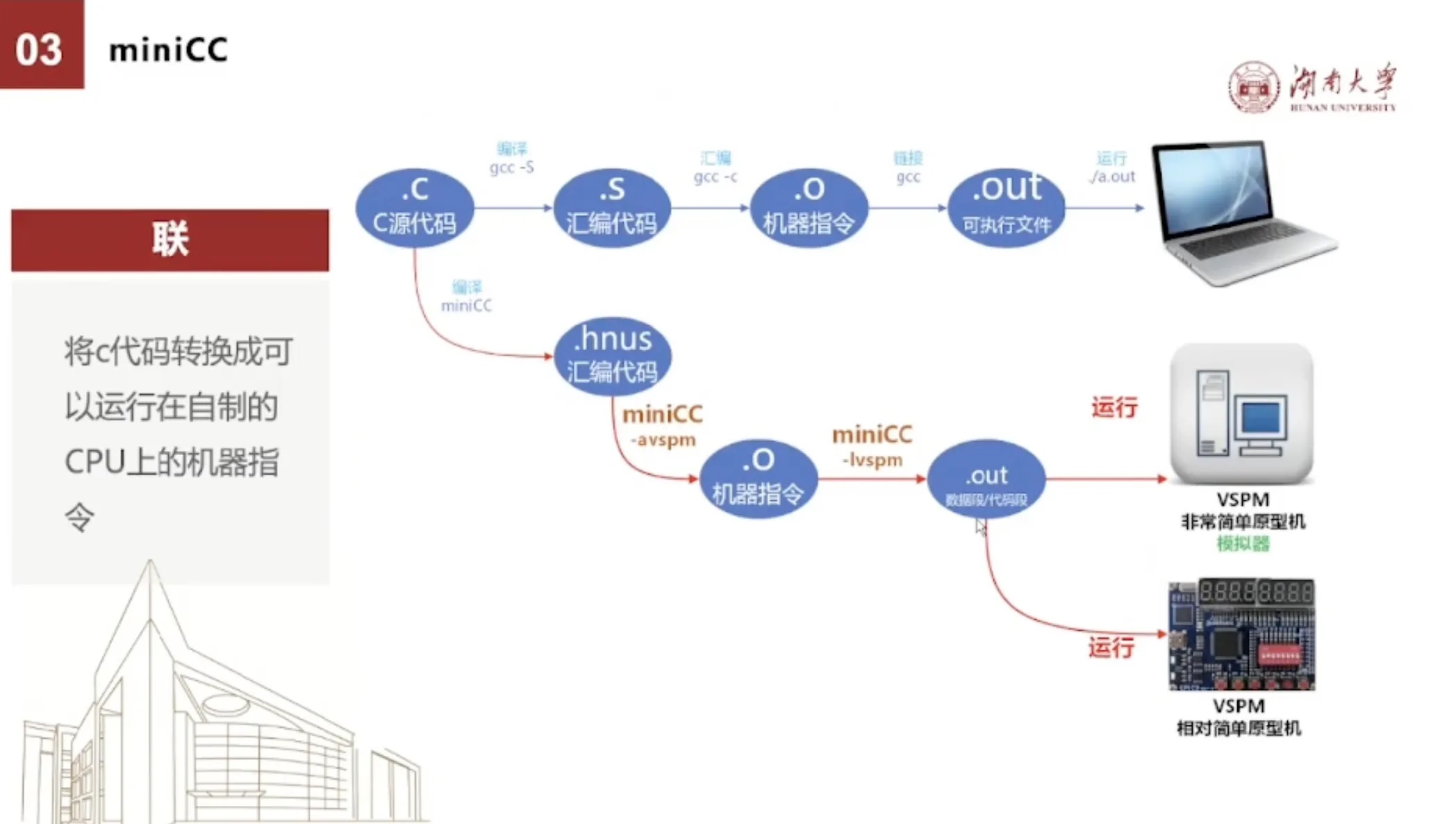 当然我联是指我们做miniCC的初心就是要跟原型机联系起来。因为GCC等工业级编译器,根本就不知道我们开发了自己的原型机,所以也不可能支持将C语言代码转换到我们原型机上能执行的信息指令,那我们就只能自己来。因此我们就把miniCC也严格按照编译、汇编、链接程序,把C语言代编译到我们的原型机上能够运行的一个指令。同时因为VSPM有鲲鹏的香橙派,有之前的这个口袋猫,模拟器,所以我们这个代码在这个上面都是能运行。