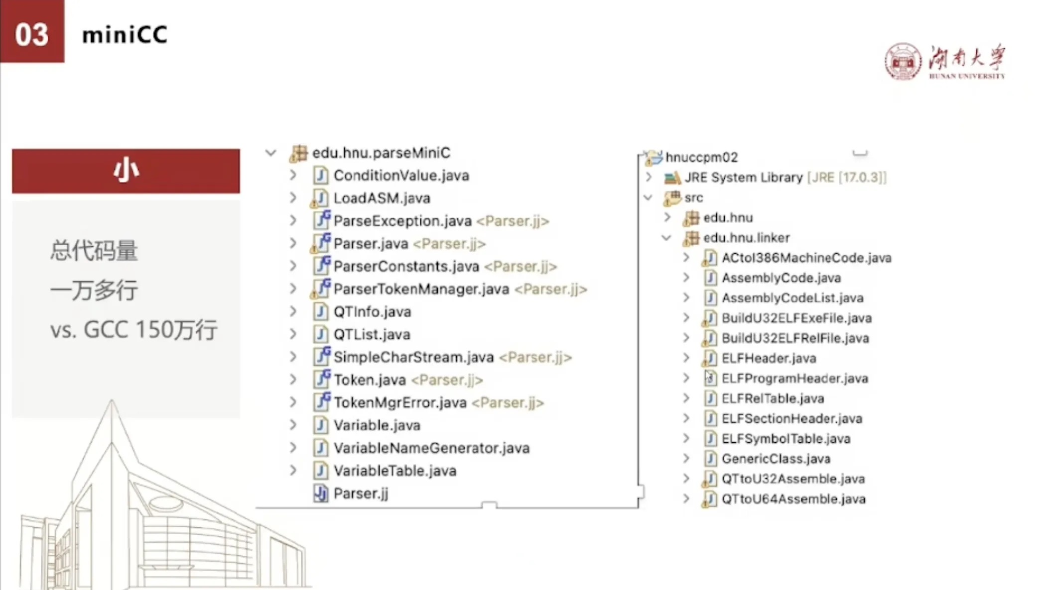 左边这个是我们这个编译器的一个最简单的版本,它就只支持整数的定义,只有顺序语句、分支判断语句、循环语句的C语言进行处理。整个只有两千余行代码。