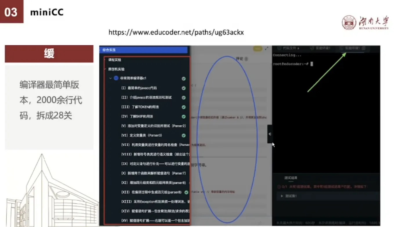 为了更好的缓一点,就是让每一个学生在半个小时或者1个小时能够有所收获,我们也在头歌平台上搭建了一个实验平台。把两千余行代码最简单版本的开成了28关,用闯关的方式,每一关都做一点点任务,并且都是可以独立运行看到成果的。所以对于这个编译器来讲,它实际上并不需要你去先去学边缘理。而是说只要你有一点代码的基础,就可以跟着这个指导去完成一个简单的编译器。其他的模块我们也都按照这个方式进行拆解。