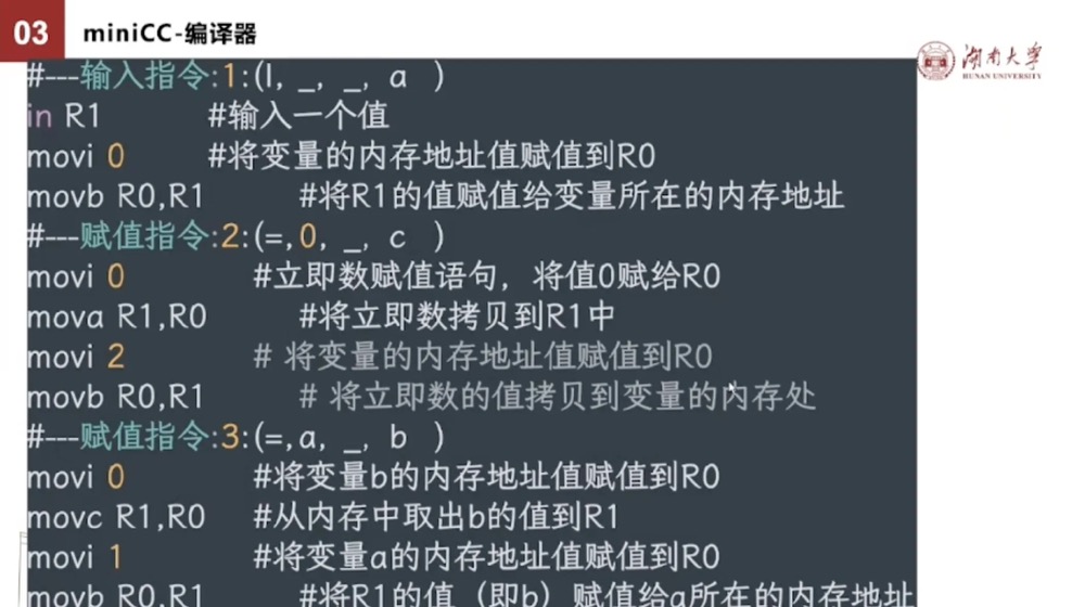 因为都是我们自己写的代码,每一个转成几条汇编指令,或者单独的一个汇编指令分别是什么意思?我们都把它以注释的方式都生成了。这样一来,通过使用这个编译器我们能够更加清楚的知道C语言代码是怎么转成的四元组,四元组又怎么转成了汇编代码。每一条汇编代码分别代表什么意思?哪几条汇编指令组合起来就正好实现了一个四元组?就更容易学习和理解。