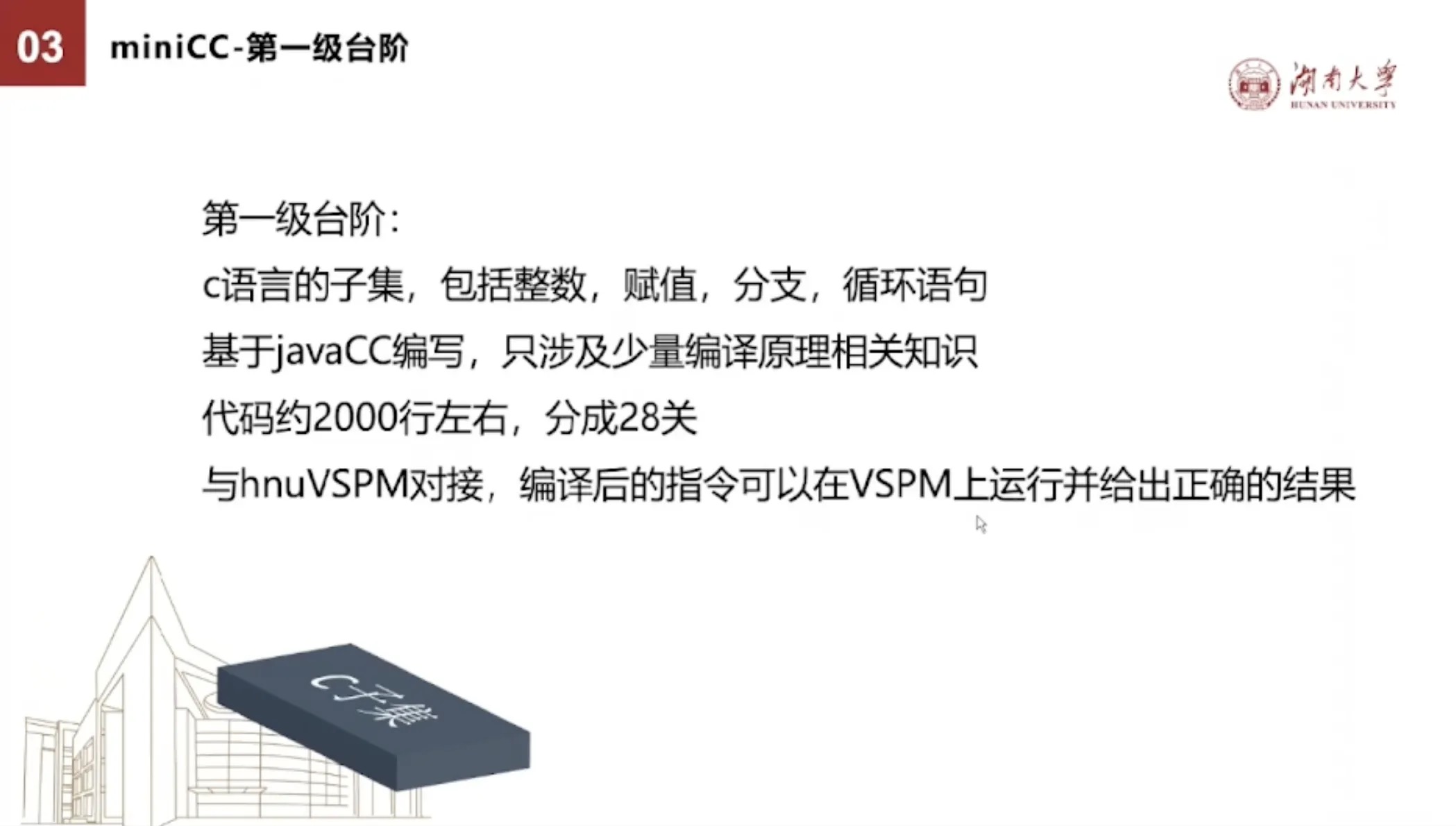 基于javaCC编写,只需要学生理解少量的正则表达式,就能写出一个简单的编译器。这个代码大2000行左右,分成28关。我们再用大约几百行代码,就能够把这个编译器产生的四元组转成我们原型机上的汇编或者机器指令。就能够与hnuVSPM对接,编译后的指令可以在vspm上运行并给出正确的结果。
