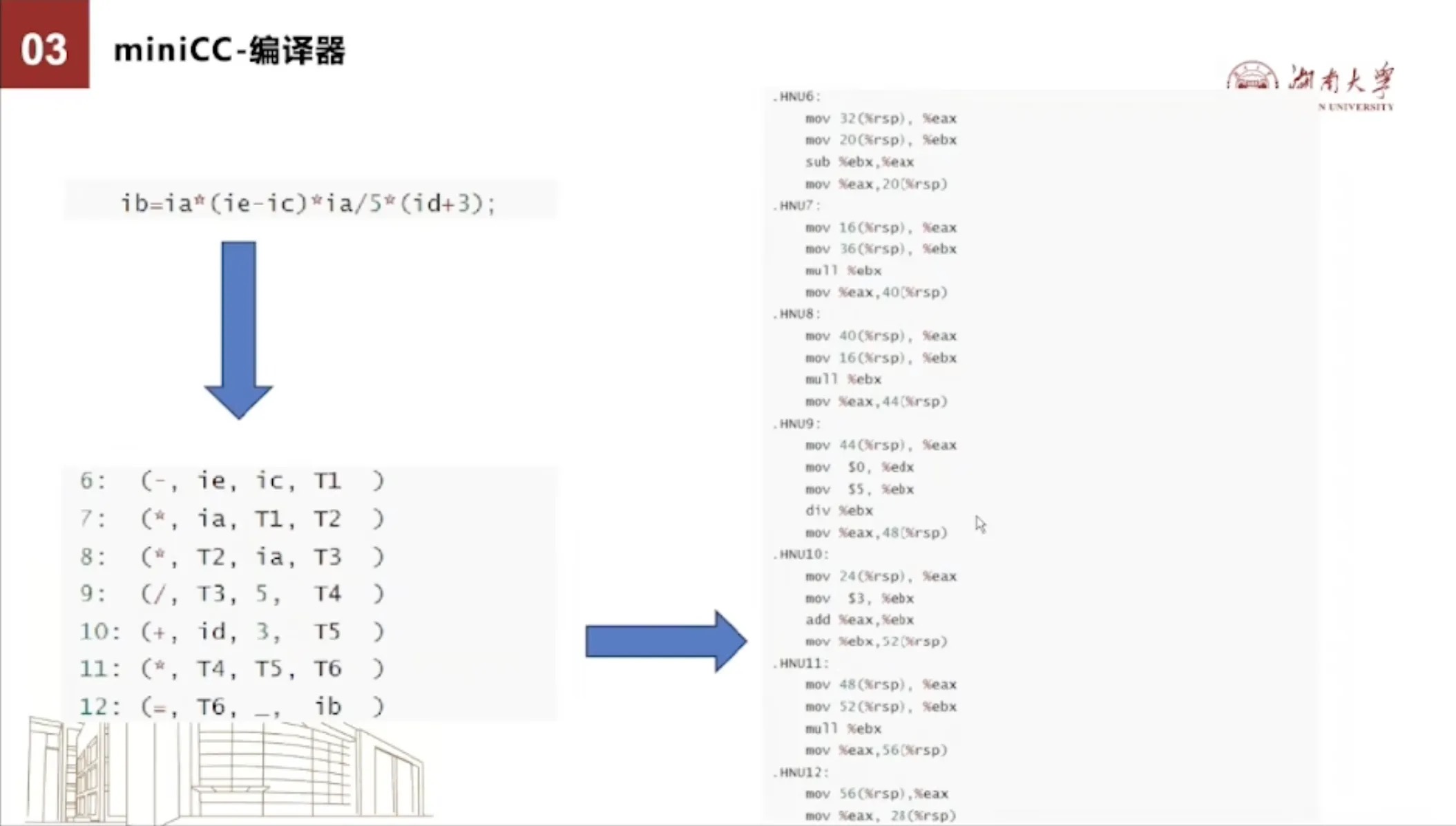 我们也可以把四元组转换到其他平台上。比如下面就是一个C语言的一个表达式计算语句,这一个表达计算语句就转成了七个四元组。而这七个四元组我们又转到了X86+Ubuntu的例子。