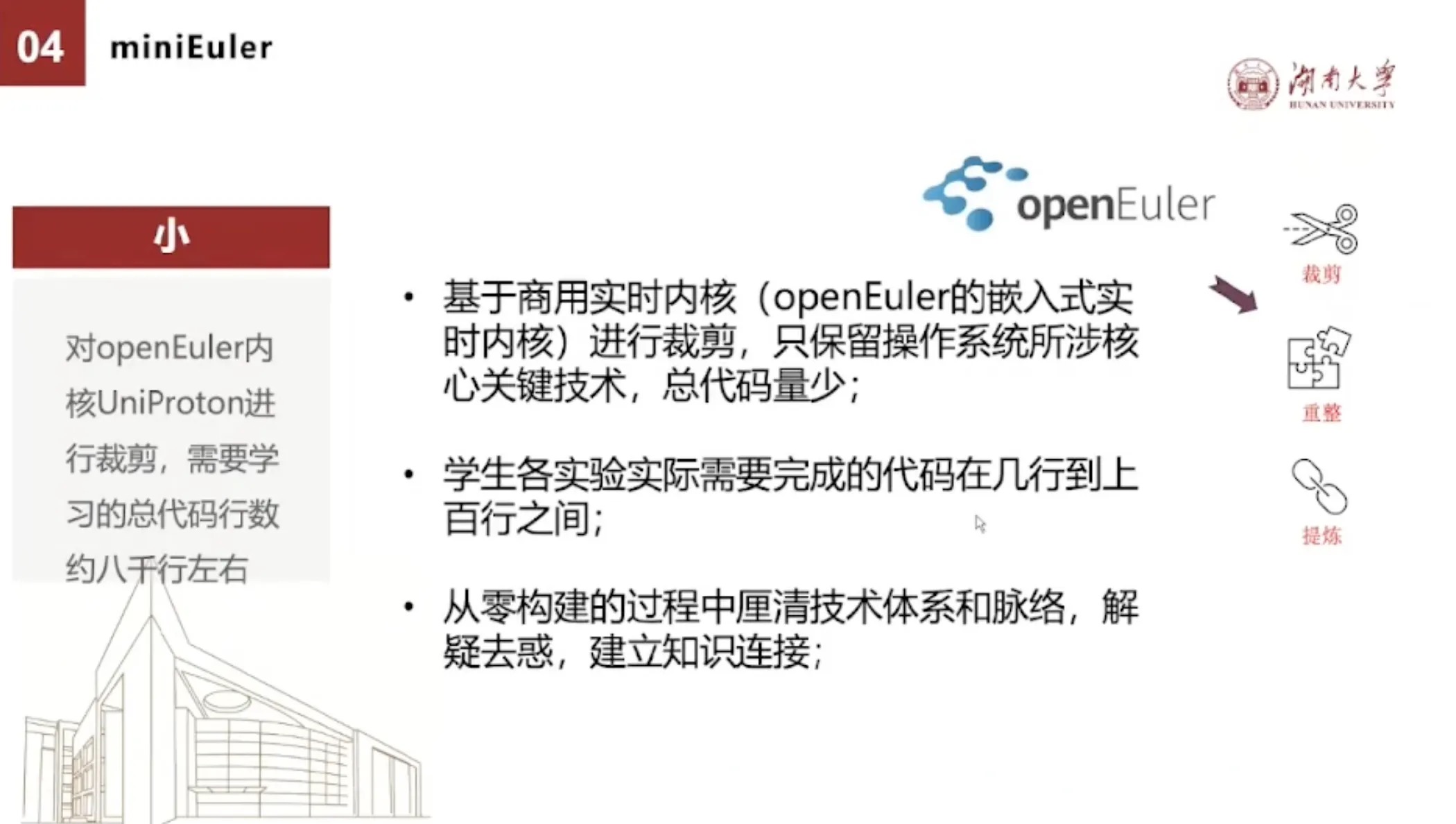 openEuler是华为的一个开源操作系统,代码量非常的多。它也是百万甚至千万行级别的这么一个操作系统。它有一个嵌入式的实时内核,它虽然是七年级的内核,但代码也是数万行到十万几十万行,这显然也是不适合来进行教学的。
