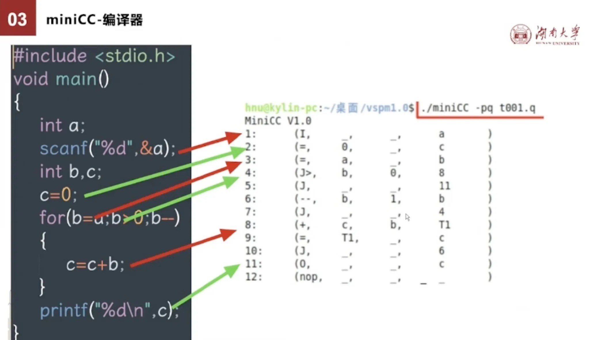 首先是编译器,把C语言编译成四元组。