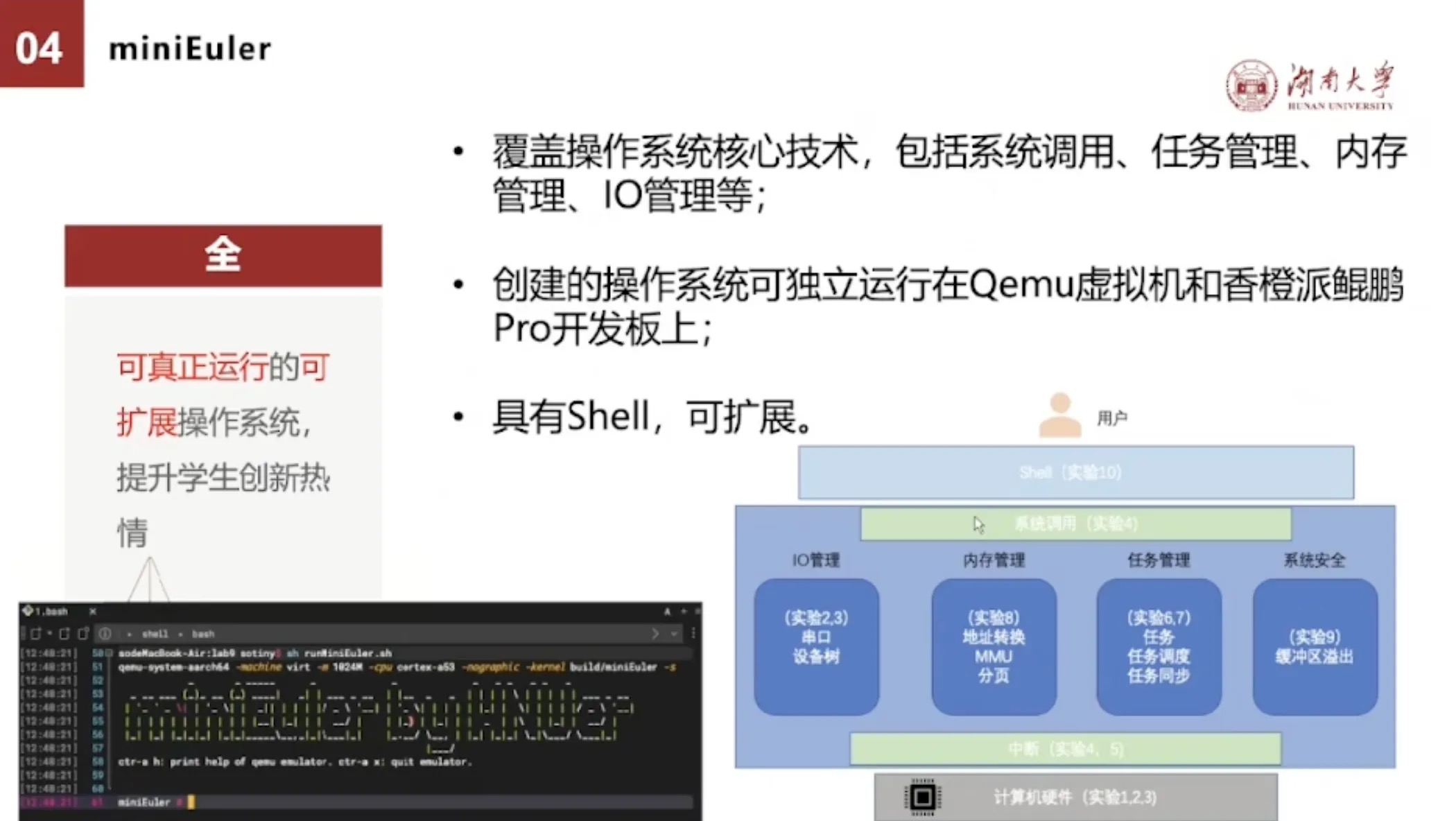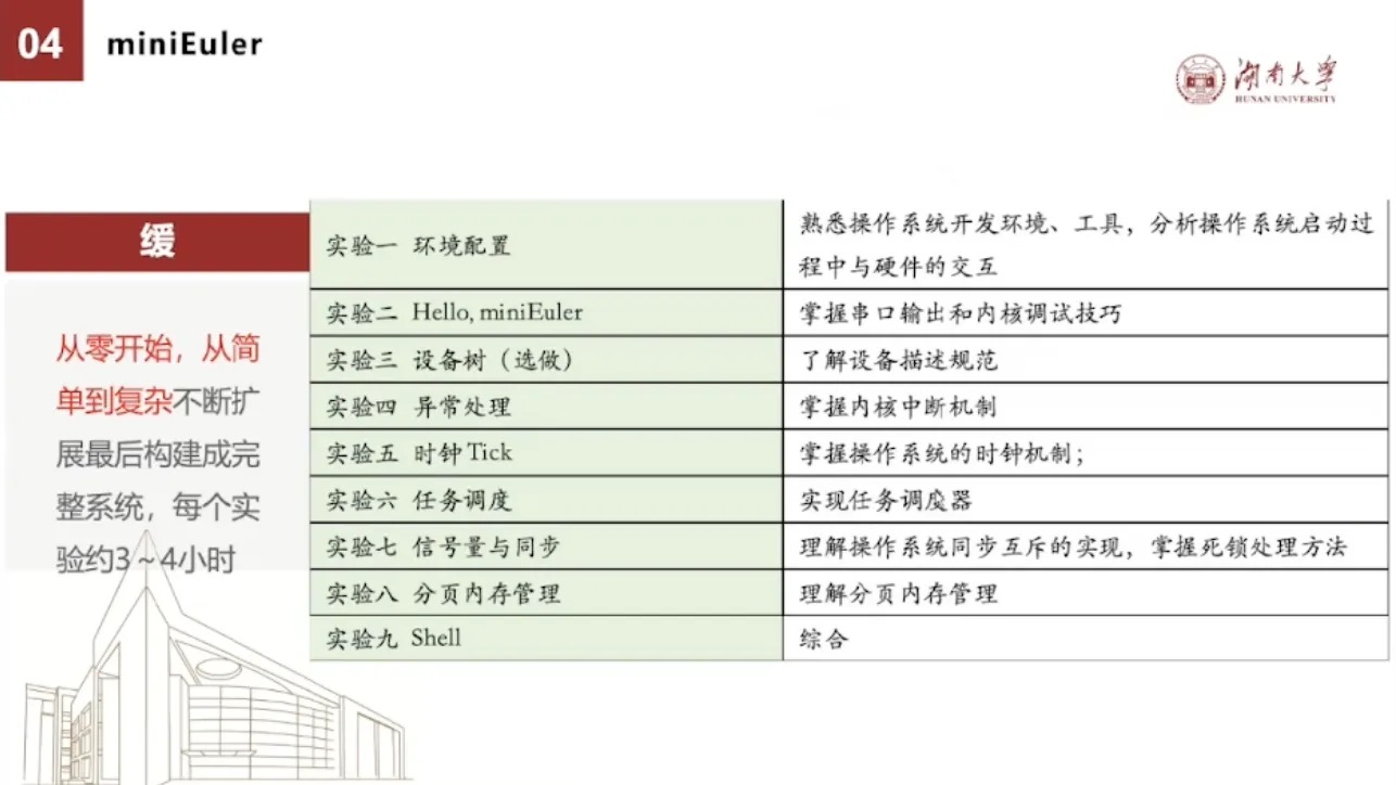 从全的角度来讲,我们虽然只要去做这几行代码,但是miniEuler是一个可真正运行的操作系统,覆盖操作系统核心技术,包括系统调用、任务管理、内存管理、IO管理等核心技术。