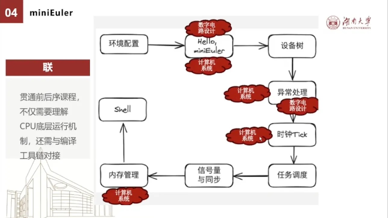 我们可以看到,我们这几个实验实际上是一个集大成者。它不仅是涉及到我们的数字电路设计,同时还包括计算机系统。这个计算机系统实际上就包括了我们的miniCC的概念的理解。所以我们看到这几个实验,它贯通了前后前序和后续过程,不仅需要去理解这个CPU的底层运行机制,还需要与编译工具链对接。甚至还要根据操作系统的这种特性,每次改一点东西,都要把编译器进行一个更多的扩展。