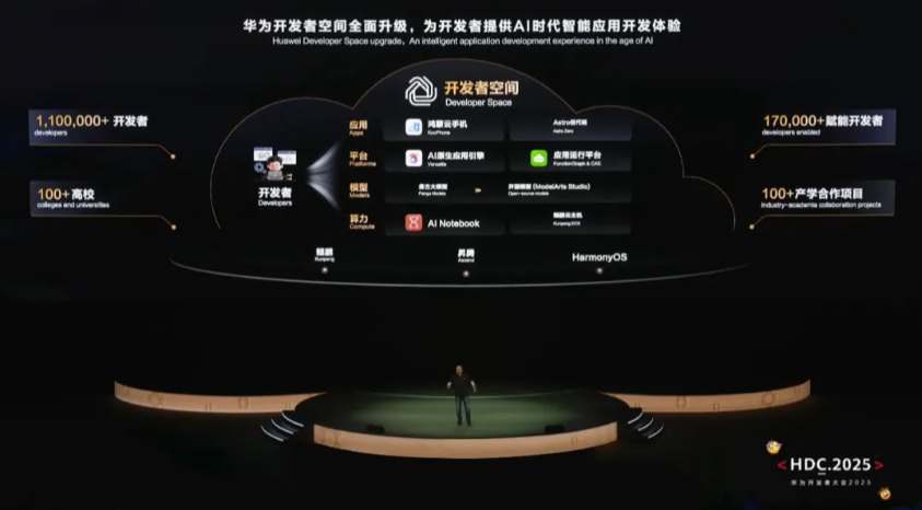 华为开发者空间是为全球开发者打造的专属云上成长空间,汇聚昇腾、鸿蒙、鲲鹏等华为根技术,为开发者提供免费算力资源,整合云上AI开发工具链及配套技术案例,帮助开发者在AI时代下快速开发编码到应用调测,打造开发者智能AI应用开发平台。自去年发布以来,一直致力于汇聚华为优质开发资源及工具,覆盖从开发编译到测试、部署、运维的应用构建全流程。目前已吸引超110万开发者加入,赋能17万开发者使用。