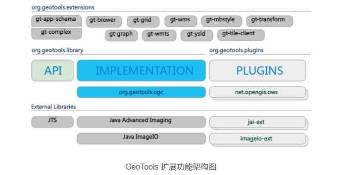 我们更进一步的,在GeoTools库的基础上实现了一些有趣的“扩展”。这些扩展提供了使用核心库的全部功能构建在GeoTools之上的额外功能。这里我们来简单介绍GeoTools的扩展功能。下面这张图是Geotools的扩展架构图: