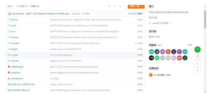 GeoTools的源码可以在GitHub上搜索得到,如果大家的网络条件不是很好的话,可以在国内使用Gitee来加速。在Gitee上也有从github上复制过来的镜像,大家也可以放心下载。关于源码的编译JDK版本,下次在讲解GeoTools的本地编译时再重点讲解,本地开发环境使用的jdk1.8,因此GeoTools使用的28.x的版本。