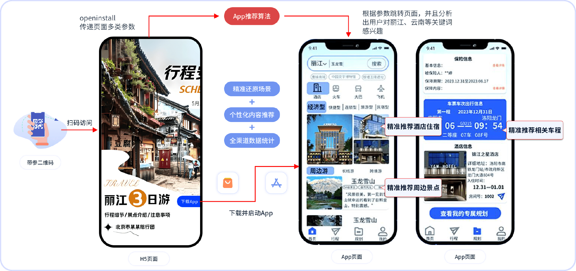 场景:针对不同兴趣群体做个性化适配,如扫码健身课程海报的用户推送健身达人、健身资讯等相关信息;给扫码丽江旅游海报的用户推送乌镇周边酒店、机票行程等信息,促进用户转化意愿。