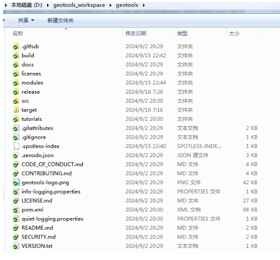 GeoTools的源代码托管在Github上,大家可以从Github上下载自己需要的版本。由于我个人电脑上安装的是JDK1.8,因此我们能选择的最大的GeoTools版本就是28.X。基本上也够用了。首先我们从github的代码中心下载源码。这里我们对下载的源码进行说明。