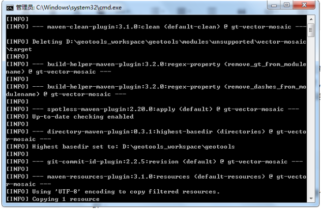 通过源代码可以看到,GeoTools是一个多模块的项目。在Maven中,多模块采用插件式组装在一起,在需要的时候,Pom文件会根据我们定义的依赖项进行组件的搭配,实现我们的需求。每个模块都有自己独立的Pom.xml文件。子模块的项目文件继承了父模块的项目文件。最上级的模块,是根模块。Geotools的模块之间有互相依赖的关系,因此第一次运行,需要完整的构建整个项目的包,进行完整的编译。下面我们进行代码的编译。
