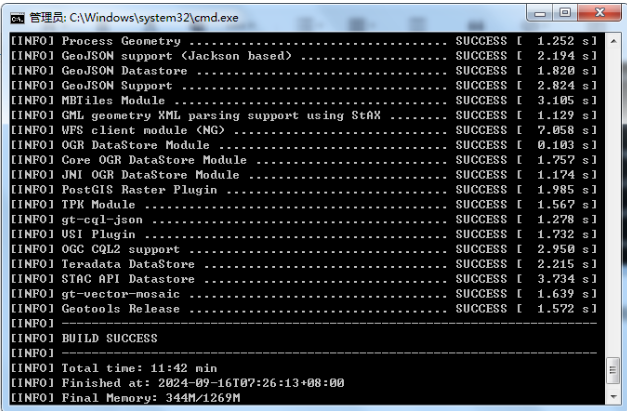 在控制台中看到build success的文本即表示构建成功,同时输出了编译时间、一共的耗时、编译的内存消耗。