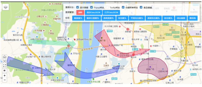 在博客中介绍过geoman标绘的具体实现,使用Leaflet GeoMan结合天地图进行自由标绘实战。基于GeoMan的标绘只能包含了常见的点、线、面、矩形的空间对象的标绘。在一些面向特种行业的应用中,我们会遇到特种标绘。比如用来表示敌我双方态势的战斗标绘,比如在一场战斗中的敌我接敌,各方的支援力量的介入,战斗的结果等等过程需要进行集中的标绘。如下图所示: