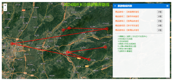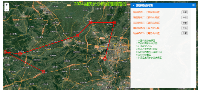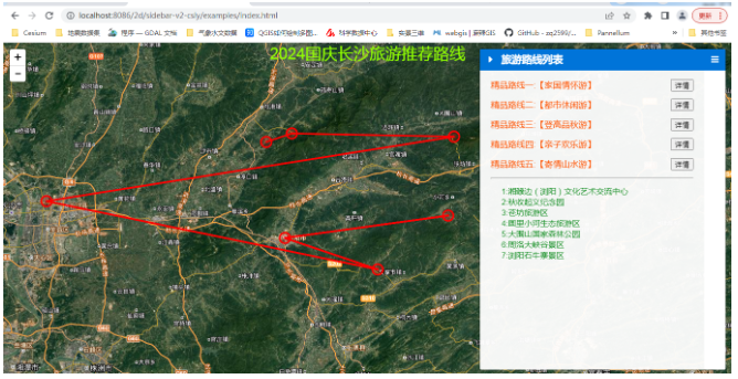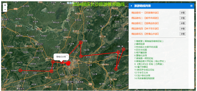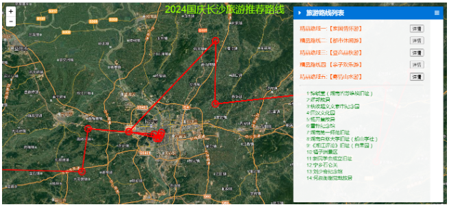 国庆旅游黄金周,全国各地的文旅部门现在都是使出了浑身解数,期待在今年的黄金周中吸引到我们更多的游客。长沙市作为热门的旅游城市,当地的文旅部门也是开始在各个平台进行广泛的宣传和呐喊。包括长沙本地宝在内的一些互联网平台也是推出了2024年的精品旅游路线推荐,根据不同的旅游需求,按照家国情怀、都市休闲、登高品秋、亲子欢乐、寄情山水主题,给大家组织推荐了5条精品的线路。不过官方是给出了旅游景点地名,那么作为一个GIS开发技术人员,我们是否可以结合本专业来进行一种旅游地图的时空碰撞呢?将地名地点利用WebGIS技术在地图上进行展示,进而为不同的路线分析距离、选择适合的交通工具出行等等,从而更精准的为我们的旅游服务和做好旅游参考。