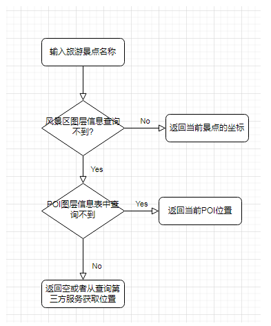 根据 上图可以看出,首先我们需要输入景点的名称信息,根据优先级的策略,我们优先查询风景旅游区的图层数据,如果图层中可以查到当前景点,则直接返回景点的位置经纬度。当然,不可避免的是,有一些数据比如餐饮或者网红打卡点,不一定是风景旅游区,因此无法在对应的图层中找到,针对这部分数据,则需要进一步的关联到POI图层中去继续查询。如果能查询到位置信息,则使用POI的经纬度信息,反之则返回为空,如果有第三方接口如天地图的地理编码查询接口服务,则可以调用这个服务来查询出对应的位置的经纬度信息。最后根据返回的经纬度信息在Leaflet中进行可视化。