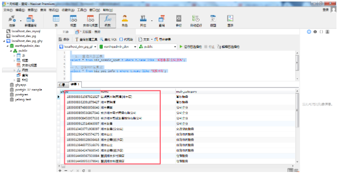考虑到地名地址的信息不一定是完全准确的,一些名称信息等可能是不全的,如果有能力的话,最好使用分词的模式来进行关键词匹配,合理为了简单起见,暂时使用在数据库中的模糊匹配来实现。如果在生产环境中,则不推荐大家这么用,第一是性能不好,第二个是查询的效果也不是非常准确的。查询的SQL非常简单,这里直接给出查询语句,关于原表的表结构,受限于篇幅原因,这里不进行展开,感兴趣可以私聊或者翻阅之前的博客内容,有详细的介绍。