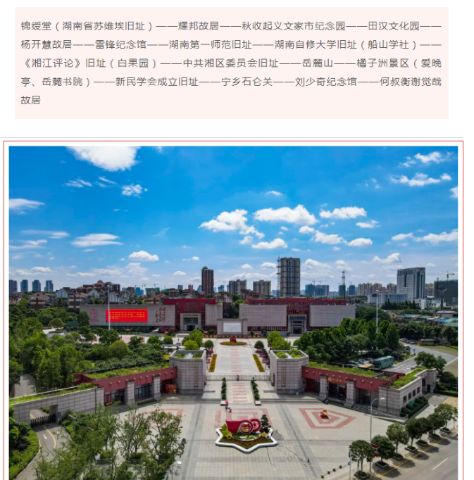 锦绶堂(湖南省苏维埃旧址)——耀邦故居——秋收起义文家市纪念园——田汉文化园——杨开慧故居——雷锋纪念馆——湖南第一师范旧址——湖南自修大学旧址(船山学社)——《湘江评论》旧址(白果园)