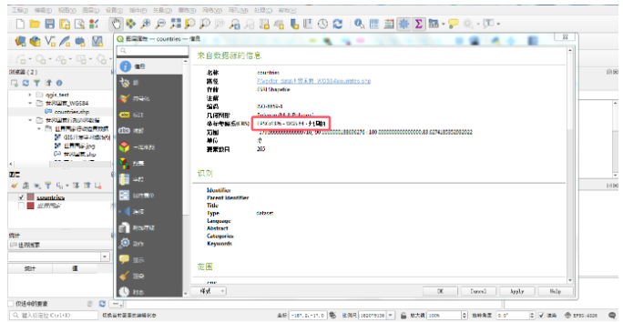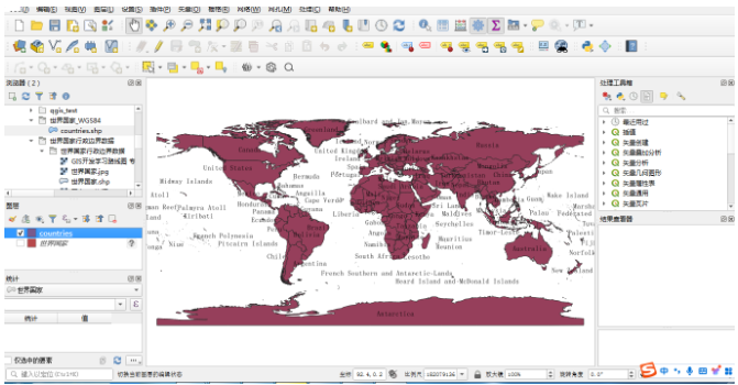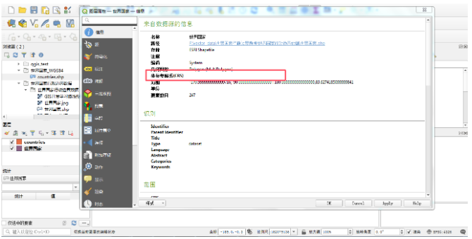 下面这份数据是没有设置空间参考的全球国家矢量信息,我们使用Qgis软件打开数据可以看到以下的信息。