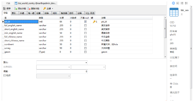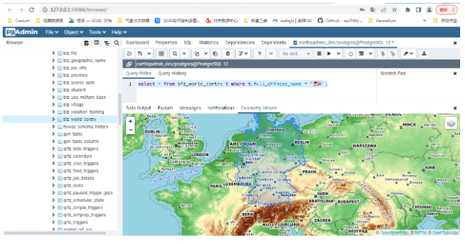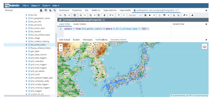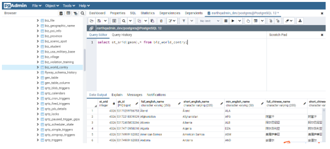 在使用Junit中运行上述代码后,即将全球数据信息插入到空间数据中。接下来我们将使用数据库端软件来验证是否成功的将数据插入到空间数据库中。这里我们以pgAdmin为例来进行讲解。我们在PgAdmin中打开查询窗口,然后执行以下语句: