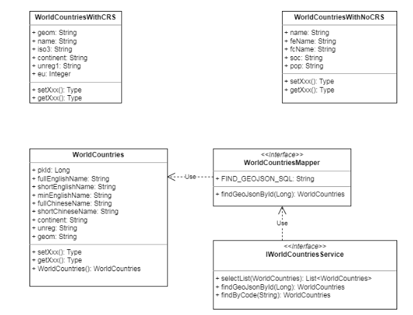 以上就是三个基础的实体类。在进行空间数据库的操作时,采用的是Mybatis-Plus技术框架,在前面的博客中,关于Mybatis-plus如何操作空间数据库,花了很多的时间来进行处理,因此这里不再进行赘述。