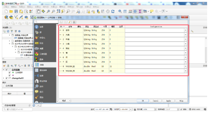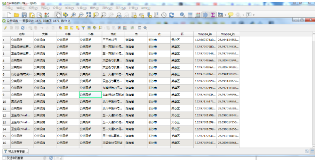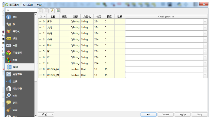 shapefile文件其实是文件数据库的一种,它将数据的信息写入到shapefile文件中,然后在其它的电脑终端中可以直接共享这些数据,解析这些属性信息。为了介绍方便,我们将shapefile与常见的关系型数据库进行对比,可以这么进行理解。一个shapefile就是一个database,而一张表就是一个属性表。属性表格中的字段、数据类型、长度、精度等就是与关系型数据库中的数据列是一个意思,而数据行基本就是数据库中一行数据的意思。下面是以某年度某城市POI的矢量数据为例进行讲解,在Qgis中打开字段表如下: