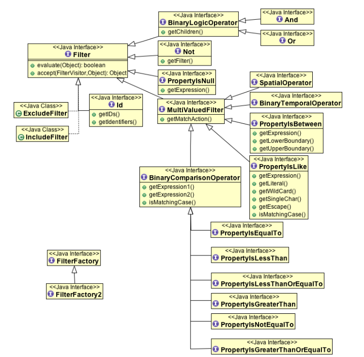在GeoTools中,关于Filter的相关类,非常的庞大,这里不全部展开,以防止抓不住重点。先给一个Filter的类图给朋友们,感兴趣的可以先了解一下。