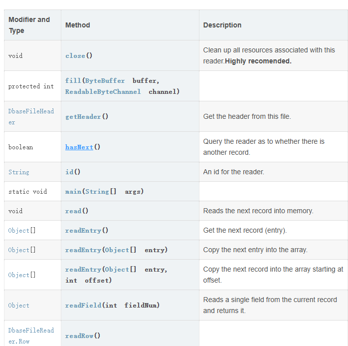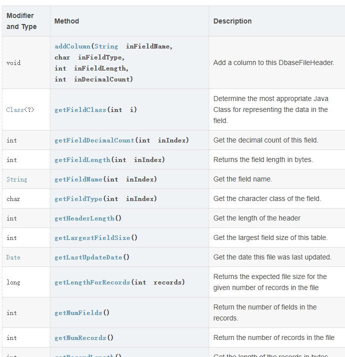 想要获取属性就是通过获取Head对象即可实现属性列表的深度解析。返回DbaseFileHead,它的方法如下表所示