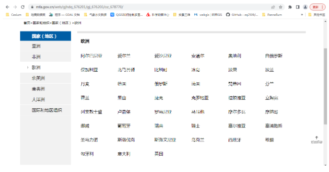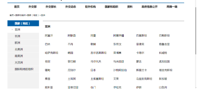 首先,我们在浏览上输入外交部的官方网站,在其网站的导航栏中有国家和地区一栏,点击国家(和地区),可以看到以下界面: