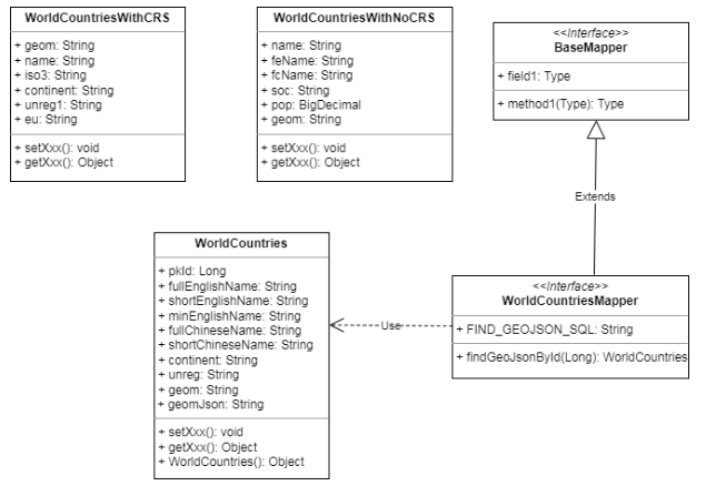 为了实现数据对象的保存,我们同时还需要定义Mapper对象。同时增加一个根据国家简码查询国家信息geometry的geojson信息的方法,关键代码如下: