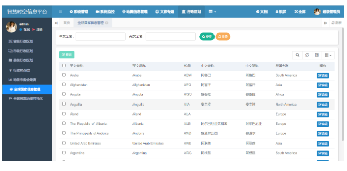 管理列表界面如下所示,在列表中展示英文全称、英文简称、代号、中文全称、英文简称、所属大洲等信息。在列表右上角,可以进行数据的刷新、暂时字段的设置。