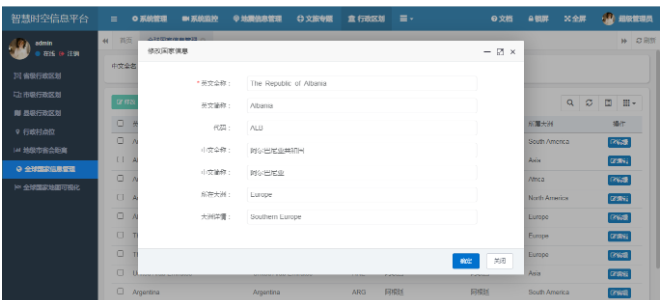 在进行后台的相关代码开发和前端界面的设计之后,基本就实现了我们的列表管理功能,可以展示国家的基本信息。支持按照国家英文全称、中文全称来进行检索。列表中提供编辑按钮,可以打开编辑页面,进行信息的修改和调整。