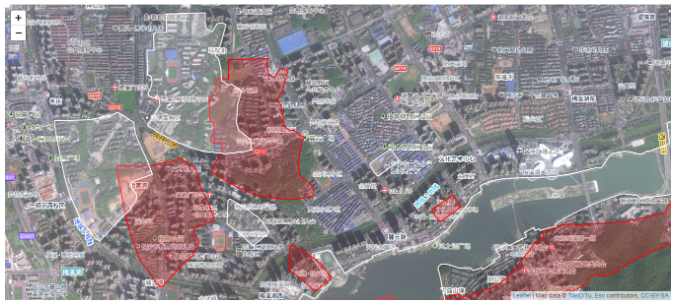 然后来看空间数据的展示情况,为了方便对比,这里选取了一些附近的面数据包括学校和楼盘信息。方便让大家理解偏移情况。以下标红的即表示在天地图下高德的数据展示情况