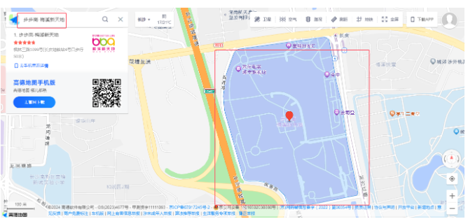 以上是高德地图的首页,跟我们之前自己实现的Leaflet地图功能类似,可以做地图的缩放,非常清晰的,可以在地图的左上角可以看到可以支持关键词检索。比如在地址检索框中输入“梅溪湖步步高”,可以看到系统做了以下检索: