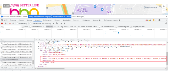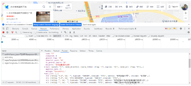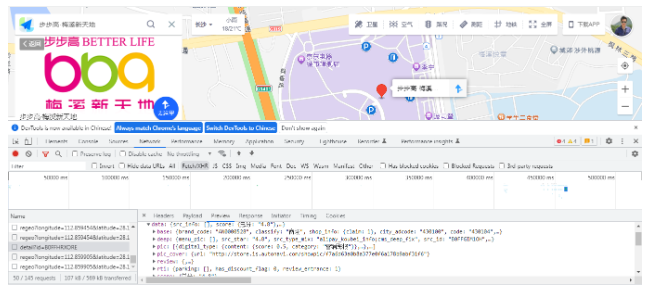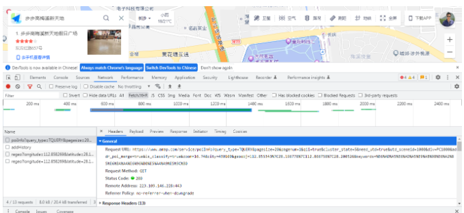 可以看到,它在查询检索界面不仅将目标地址进行了列出,同时还在地图中展示了一个空间边界的范围,就是一个商场的外围边界。而这个外围边界就是指的AOI数据。 我们可以在控制台来看一下它的主要请求过程是怎么发生的。