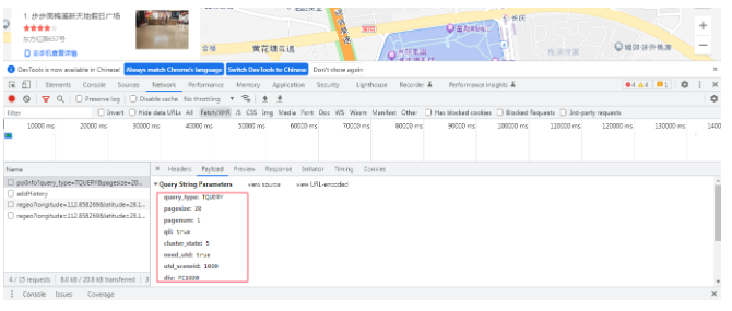 为了能准确的获取目标兴趣点的边界数据,我们还需要对相关的接口进行介绍。主要分为两个接口。一个是获取目标兴趣点的列表信息,第二个是通过详情id获取坐标信息详情的接口。先来看下检索的过程是怎么处理的,打开网页的调试模式,如下图所示: