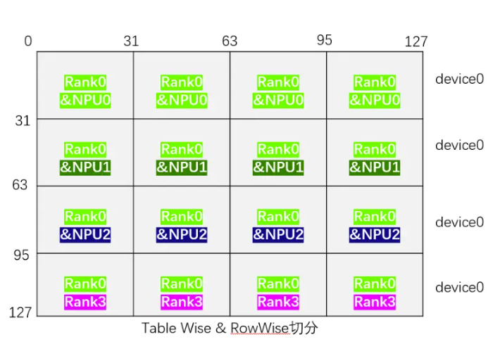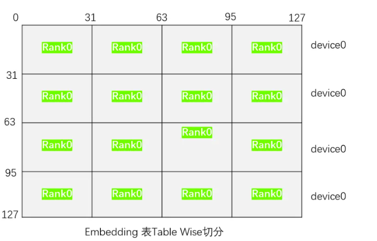 - Table Wise切分:表示将所有embedding表放置在一个同一个device上的同个Rank上,其余的Rank和Device不放置。